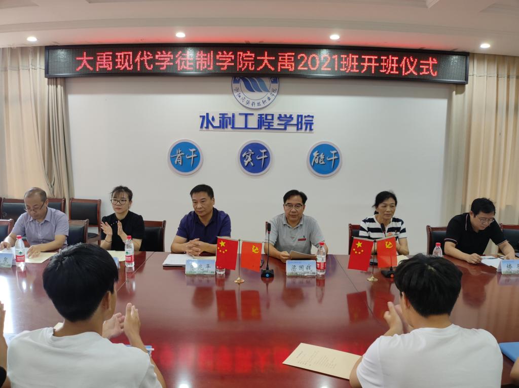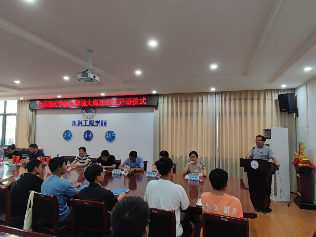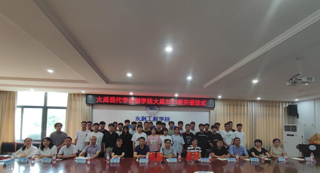 10月8日,大禹现代学徒制学院在水利机电楼A319会议室举行大禹2021班开班典礼。学校校长梁国钱、副校长朱兆平,企业代表,教务处、发展合作处、学生处及水利工程学院相关领导出席仪式,仪式由水利工程学院院长刘进宝主持。副校长、大禹现代学徒学院院长朱兆平宣读了大禹2021班成员名单。