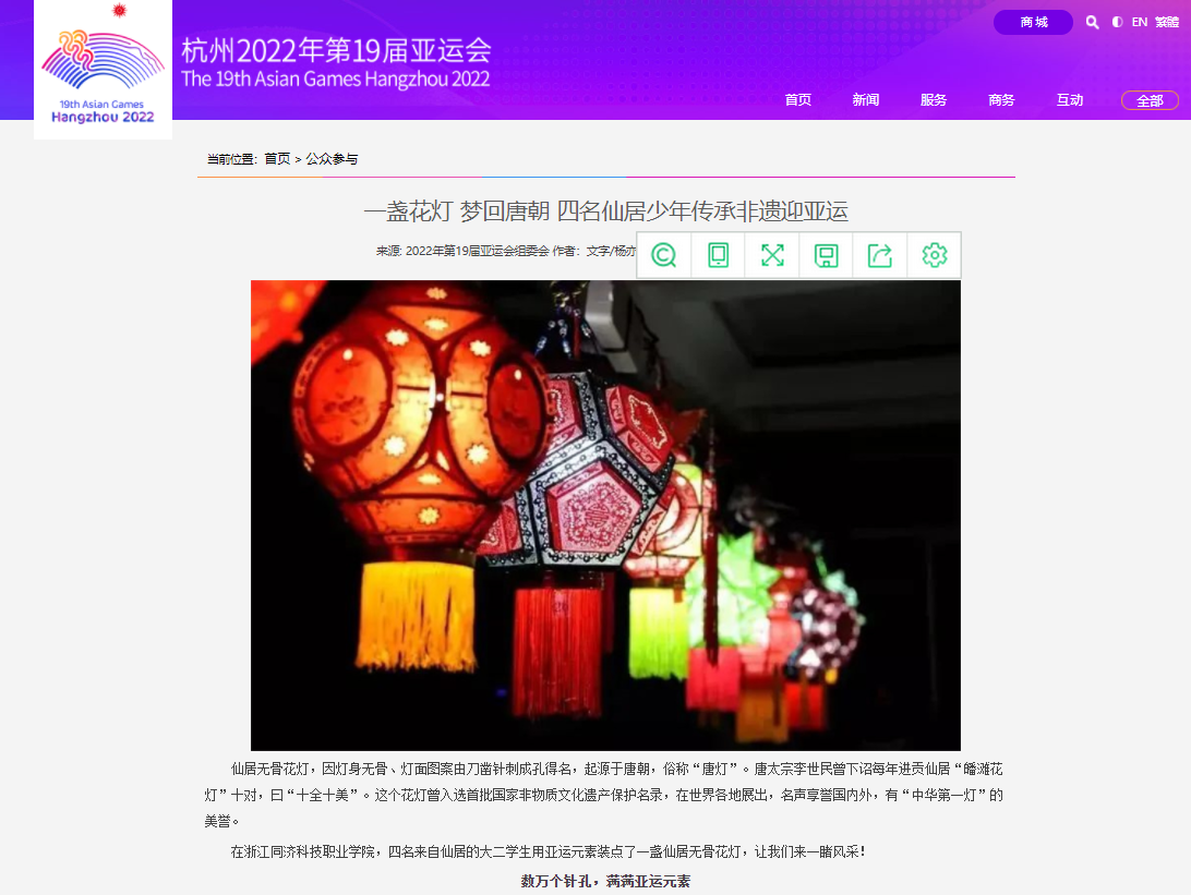 经济与信息学院学生泮韬楠带领班级同学,用亚运元素制作了一盏仙居无骨花灯,在亚组委主办的“亚运随手拍”活动中获得特等奖,受到《都市快报》等媒体的报道。近日,亚组委记者专程到我校,对泮韬楠团队和经信学院进行了采访。