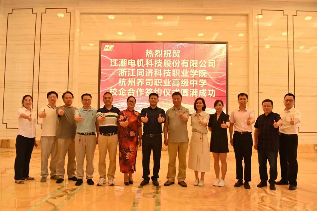2022年6月7日下午,我校与江潮电机科技股份有限公司、杭州乔司职业高级中学三方校企合作签约揭牌仪式在江潮电机总部举行。我校朱兆平副校长,江潮副总经理王琛玮、副总经理王林福,乔司职高校长却旦等出席签约仪式。机电学院院长及相关专业部教师等参加。