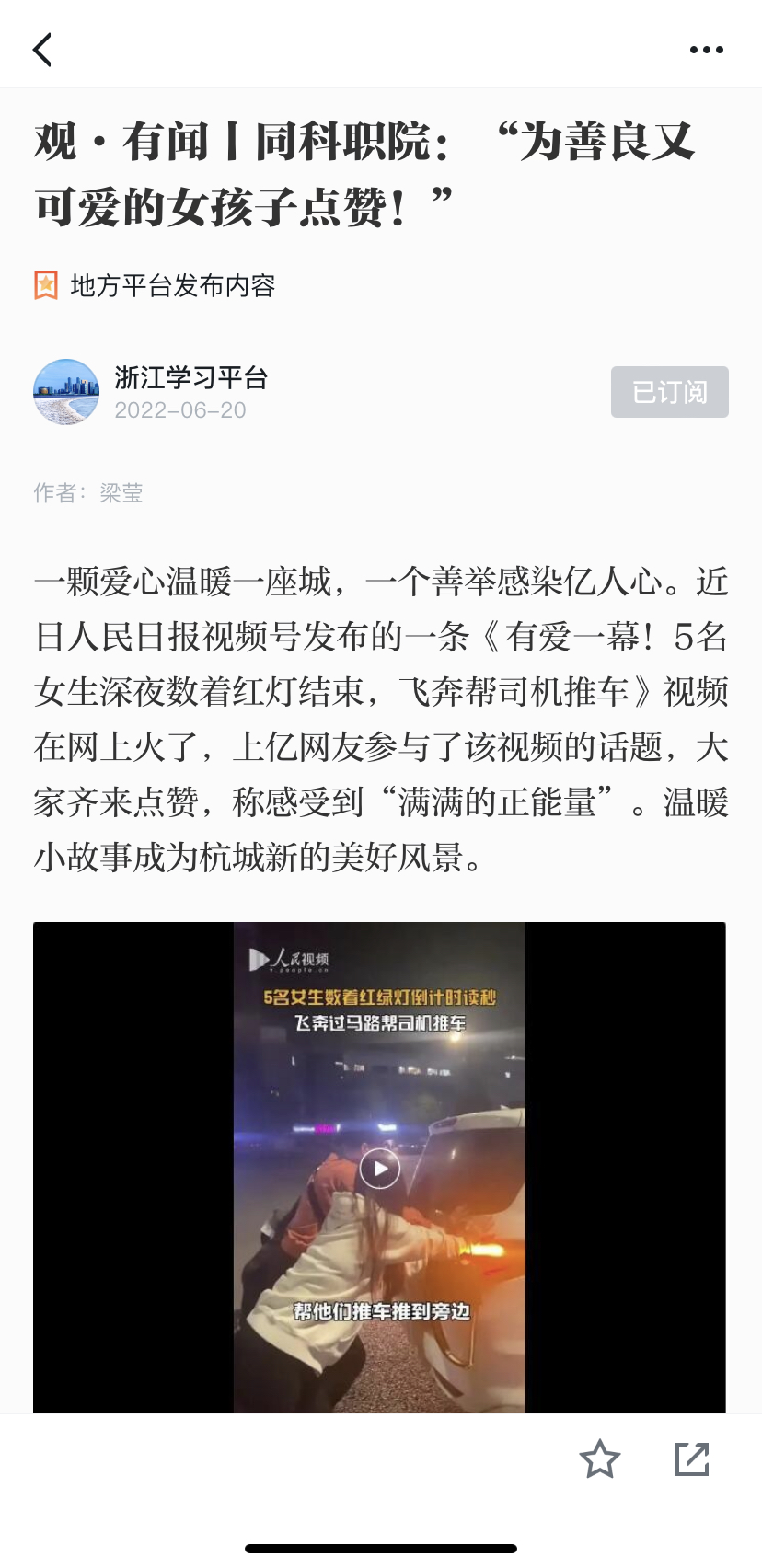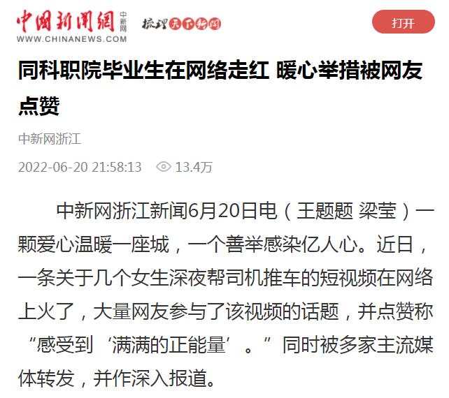 近日,一条我校经信学院毕业生朱丰吟及其同事深夜帮司机推车的短视频走红网络,还上了人民日报视频号。2022年6月14日、20日,中国新闻网、浙江文明网以《同科职院毕业生在网络走红 暖心举措被网友点赞》等为题,对视频背后的故事作了深入报道。新闻称赞毕业生朱丰吟暖心善举的同时,肯定了我校关注学生文明养成,贯彻落实“三全育人”的成效。