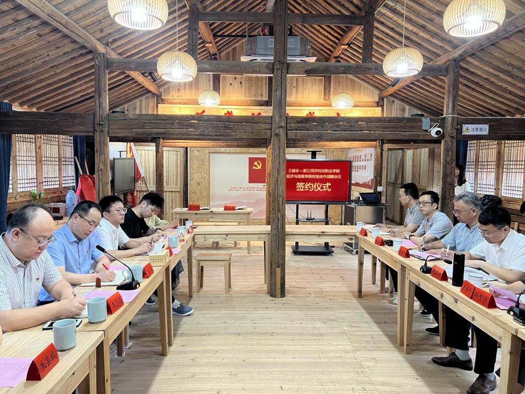 7月7日上午,我校经济与信息学院与松阳县三都乡开展校地合作战略协议签约仪式,就深化校地合作、共建党建联盟、创建战略合作基地进行了深入交流,校党委委员、副校长姜伟,学工部部长、团委书记周恺,经信学院党总支副书记王志远及部分专业教师,松阳县人民政府副县长林嘉栋和三都乡党政主要领导参加了仪式。