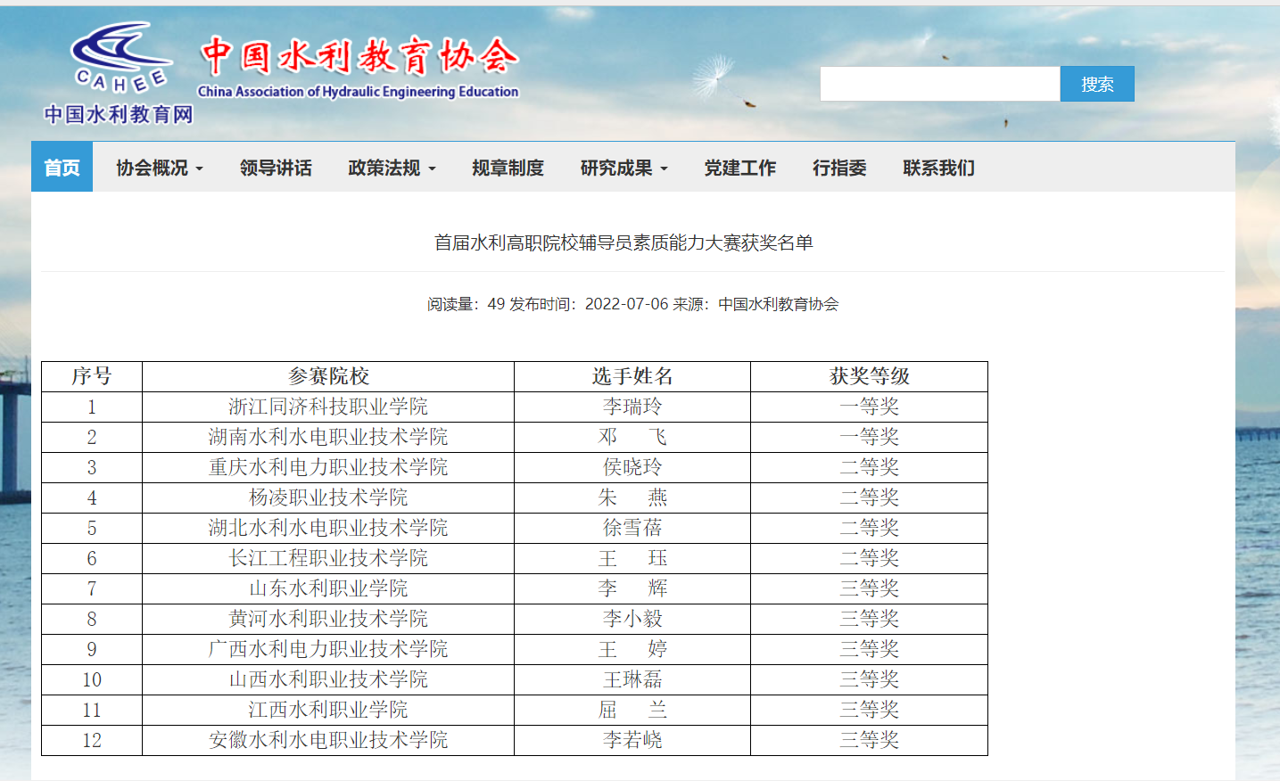 此次比赛由中国水利教育协会主办,我校承办。比赛是水利院校学习贯彻习近平新时代中国特色社会主义思想和习近平总书记关于教育的重要论述、大力加强水利院校辅导员队伍建设的一项重大举措,是检验水利职业教育发展成果、展示各高校学生工作水平、加强辅导员交流的重要平台。受疫情影响,大赛采用了线上比赛的形式。赛事设置了基础知识测试、案例研讨和理论宣讲三个环节,结合辅导员日常工作经验和理论学习成果,针对性、多维度考核辅导员的业务能力和知识储备,全面考察辅导员的理论功底、业务水平和文化素养。我校对此次比赛高度重视、精心准备、积极参与,赛前认真组织开展了辅导员素质能力大事的集训和校赛选拔等工作,为大赛夺冠打下了良好基础。