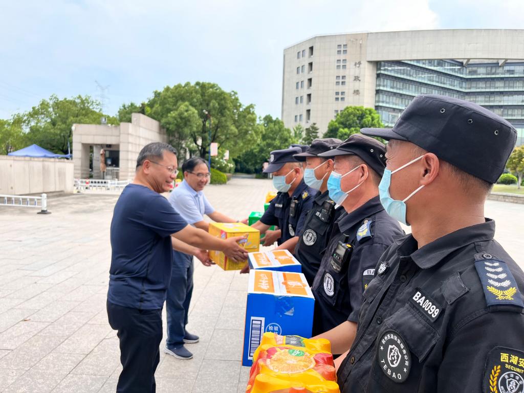 2022年7月26日,梁国钱校长和沈自力副校长看望慰问暑假期间仍坚守岗位的安保队员,对今年入夏以来,持续高温天气下依然坚守岗位的队员表示衷心感谢。