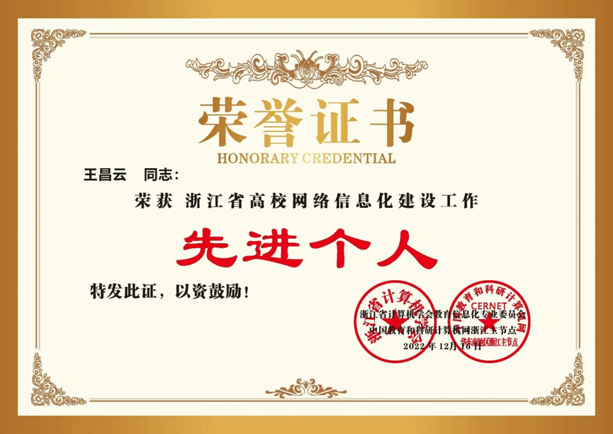 近日,浙江省计算机学会教育信息化专业委员会、中国教育和科研计算机网浙江主节点联合表彰了一批高校网络信息化建设先进单位和先进个人。我校喜获“2022年浙江省高校网络信息化建设工作先进单位——智慧校园建设方向”、“2022年浙江省高校网络信息化建设先进单位--网络安全方向”两项荣誉,王昌云荣获“浙江省高校网络信息化建设工作先进个人”。