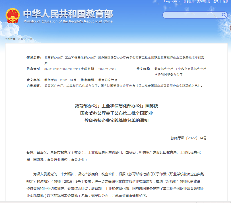 本次认定的第二批全国职业教育教师企业实践基地是为深入贯彻党的二十大精神,深化产教融合、校企合作,根据《教育部等七部门关于印发〈职业学校教师企业实践规定〉的通知》(教师〔2016〕3号)要求,进一步完善职业教育教师企业实践体系,推动“双师型”教师队伍建设的重要举措。