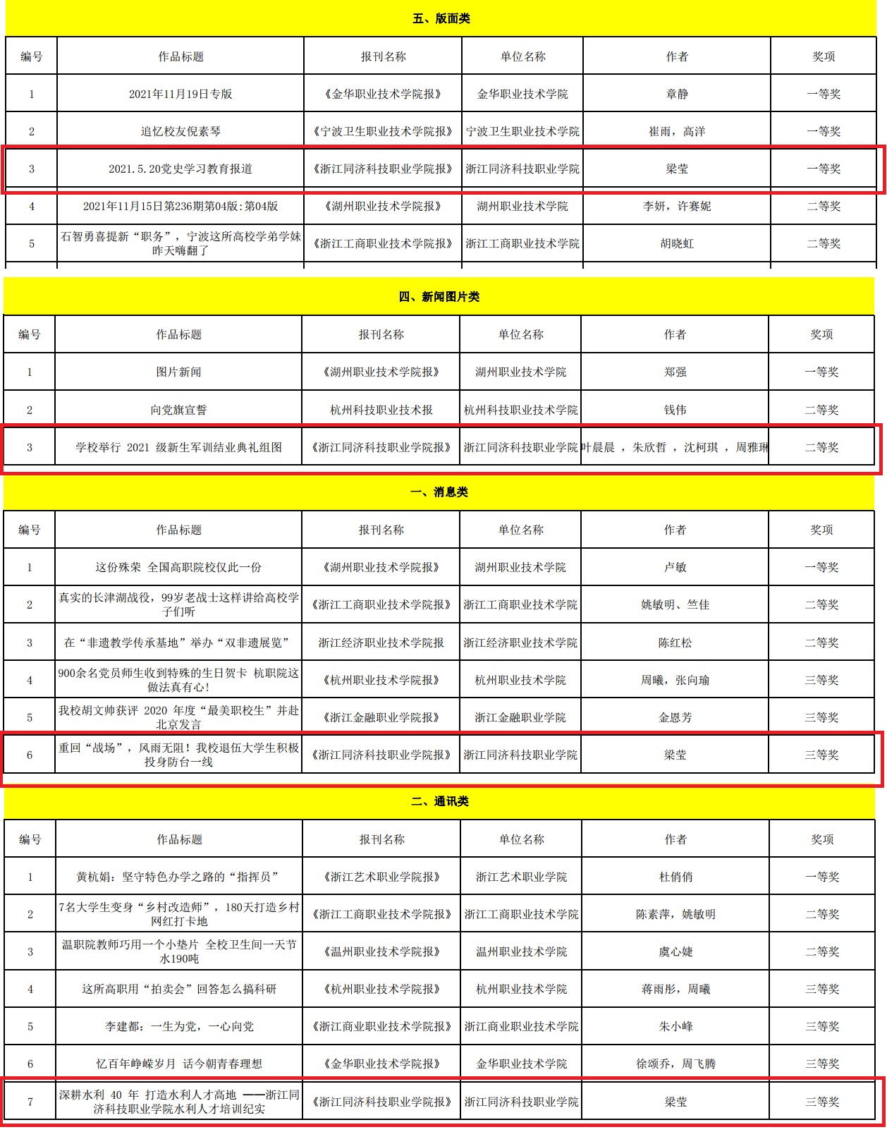浙江省“高校好新闻奖”由浙江省新闻工作者协会、浙江省高校教育学会高校校园传媒分会组织,每年评选一次。2021年度评选共设消息类、通讯类、言论类、新闻图片类、版面类、微信微博类6大类。其中高职高专组竞争激烈,仅评选出消息类奖项6项、通讯类7项、新闻图片类7项等。我校通过此次参评交流在全省高校中充分展示了自身宣传工作的水平,也获得了高校宣传战线同行的肯定。近年来,宣传部积极提升校报等校园媒体的宣传力、影响力,促进官网、官微、校报等传统媒体与新媒体融合,深入挖掘优秀师生事迹,提高宣传质量,在引领校园正确舆论导向、大力传播同科好声音、树立学校良好社会形象等方面发挥了重要作用。