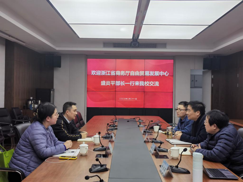 2月21日上午,商务厅自由贸易发展中心培训部盛炎平部长一行来我校交流,学校副校长朱兆平及教务处(国际交流中心)相关负责人参加此次交流会。