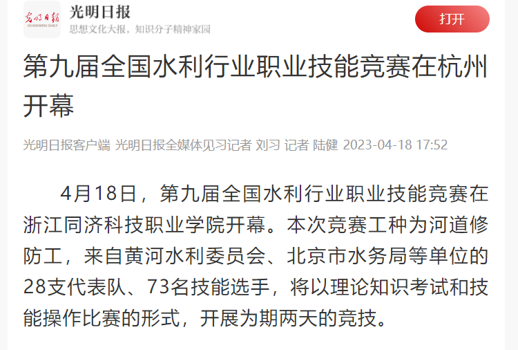 本次比赛是弘扬工匠精神、劳动精神,践行技能强国的重要途径,不仅受到水利行业业内人士的肯定,还吸引了全国各界的广泛关注。比赛期间,人民网、光明日报客户端、中国青年报客户端、中国新闻网、学习强国等多家央媒对本次比赛进行了大篇幅报道,人民网还在首页对赛事新闻进行推荐,阅读量约数百万,形成了强大的宣传声势。