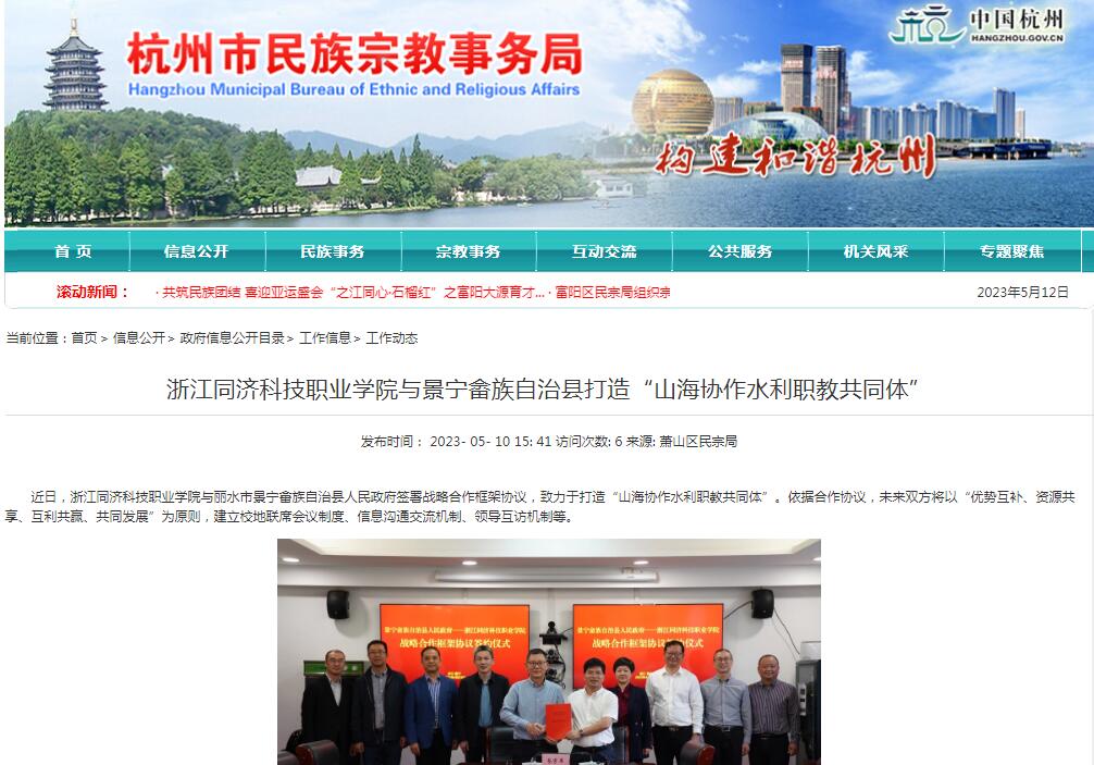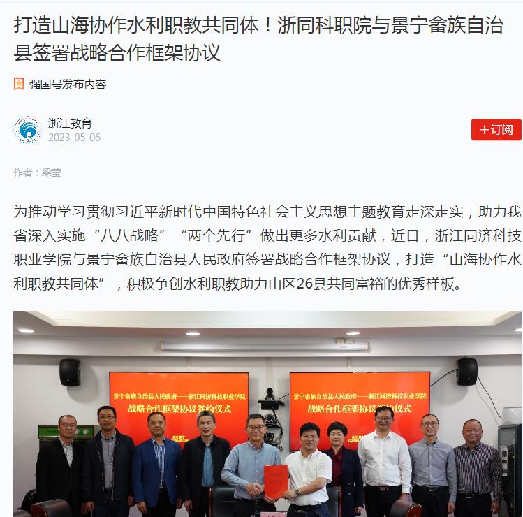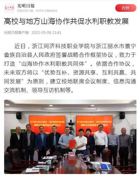 5月6日至10日,中央主流媒体光明日报客户端以《高校与地方山海协作共促水利职教发展》,学习强国浙江教育强国号以《打造山海协作水利职教共同体!浙同科职院与景宁畲族自治县签署战略合作框架协议》为题,详细报道我校与景宁畲族自治县人民政府签署战略合作框架协议,打造“山海协作水利职教共同体”,积极争创水利职教助力山区26县共同富裕的优秀样板。浙江省教育厅官网、杭州市民族宗教事务局官网等转载。
