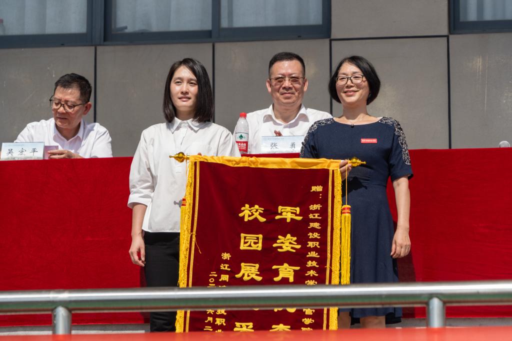 校长王卫标代表学校向辛勤付出的各位教官表示衷心的感谢,向为此次军训工作默默付出的各位老师致以崇高的敬意,向顺利完成军训任务的同学们表示热烈的祝贺!他表示,本次军训不仅锻炼了同学们的身体素质、组织纪律,同时也进行了意志、毅力、集体主义、团结协作、行为规范的教育。希望同学们能够将军训中学到的东西,运用到今后学习、生活的方方面面,不断提升自我,为争取更好的成绩而不懈努力。随后,校党委委员、纪委书记应芬代表学校向承训部队浙江建设职业技术学院士官学院院长金璐赠送锦旗。