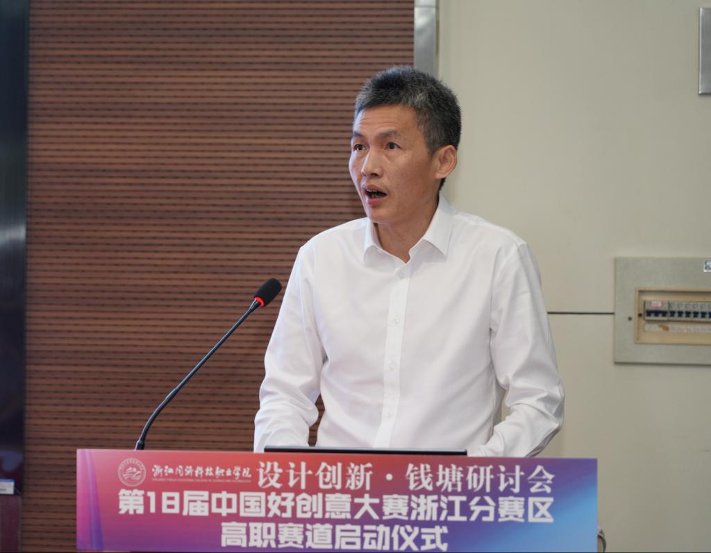 王卫标校长在大会现场致辞,他指出,习近平总书记围绕实施创新驱动发展战略、加快推进以科技创新为核心的全面创新等,提出了一系列新思想新论断新要求。党的二十大报告也明确了“创新是第一动力”和“坚持创新在我国现代化建设全局中的核心地位”。学校将贯彻落实习近平总书记的重要指示批示精神和党的二十大精神,高度重视、精心组织,努力把本次大赛办成一届高水平、高质量、高规格的盛会。他呼吁参会各方以大赛承办和研讨会为契机,探讨设计创新领域的前沿工作和未来研究的发展方向,共同为设计创新提供有价值的新洞见;利用大赛搭建的平台,探索新时代艺术设计教育中的人才培养新范式、新经验,不断提升数字创意人才培养水平,共同推动浙江数字创意教育的高质量发展。