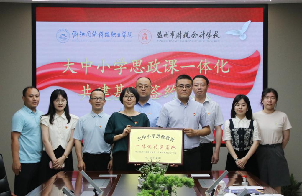 经信学院党总支书记王志远与戴剑锋书记共同签署大中小学思政教育一体化建设联盟共建协议,应芬书记为“大中小学思政教育一体化共建基地”授牌。