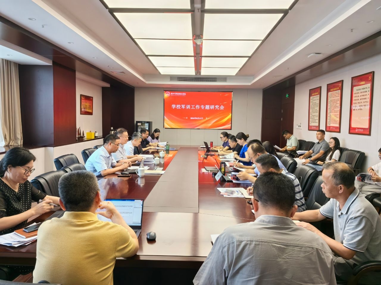 6月17日下午,学校在行政楼四楼会议室召开2023级学生军训工作专题研究会。学校党委书记张勇,校长王卫标,党委委员、副校长吴敏启,党委委员、副校长刘进宝出席会议,相关部门负责人、二级学院党总支书记参加会议,会议由刘进宝副校长主持。