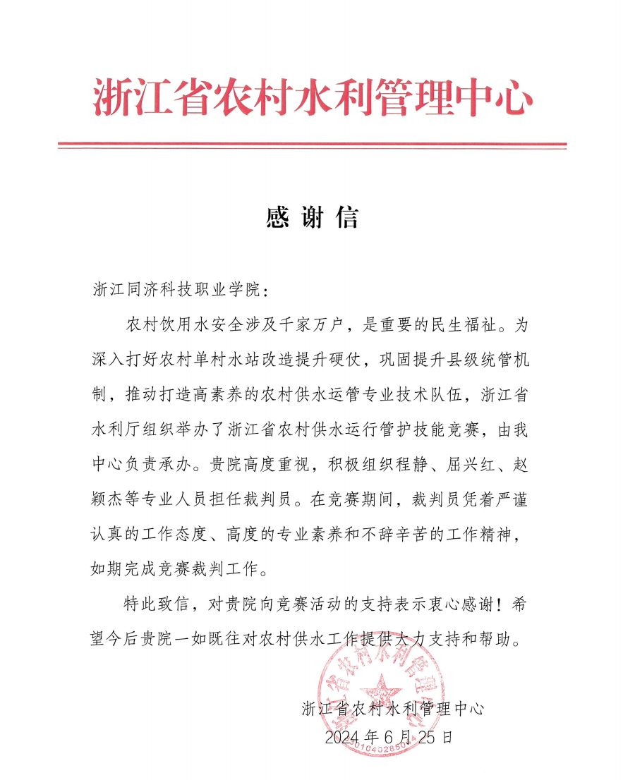 近日,浙江省农村水利管理中心给我校发来感谢信,感谢学校对全省首届农村供水运行管护技能竞赛活动的大力支持。本次竞赛于5月29至30日在杭州临安举行,由浙江省水利厅主办,浙江省农村水利管理中心、杭州市林业水利局、杭州市临安区水利水电局联合承办。全省10个地级市水利部门的10支队伍60余人参与竞赛。