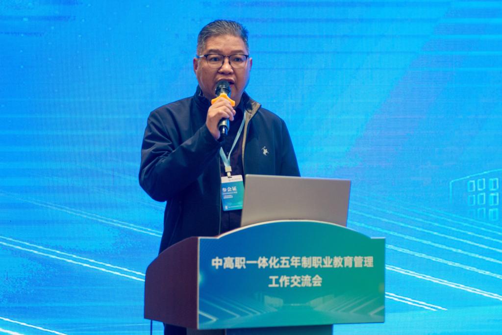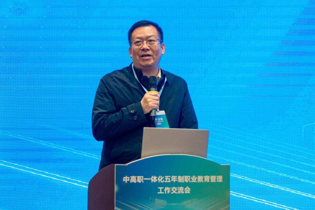 会议特邀浙江省教育科学研究院程江平教授作《中高职一体化培养模式的反思与重构》专题报告。他立足职业教育发展新形势,深入剖析了中高职一体化人才培养模式的关键要素,系统阐述了浙江区域中高职一体化人才培养模式的创新实践路径。