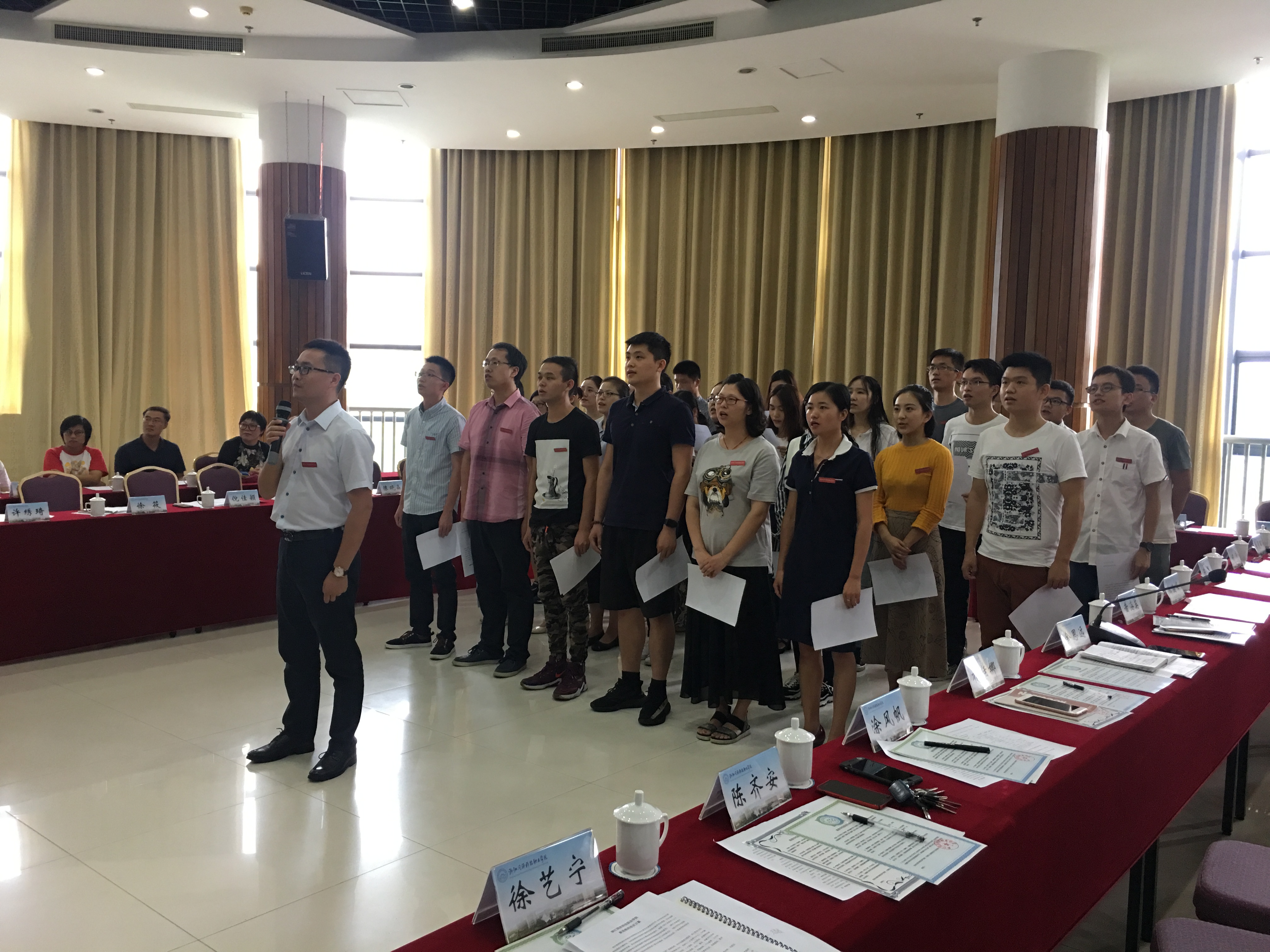 9月27日下午,在行政楼三楼多功能厅学院举行2017年新进教师培训班开班暨师德宣誓仪式。院领导丁坚钢、梁国钱、江影、郭雪莽、王建华出席会议。人事处(教师发展中心)、各系部负责人、新入职教师和助讲培养指导教师参加了会议。副院长沈燕主持会议。