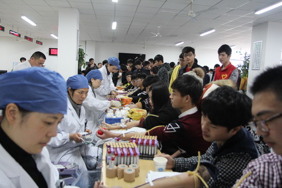 活动当日,天气阴寒,但献血现场人山人海,事务中心大厅排起了长长的人龙,同学们有序地排队、填表、验血、采血,学生志愿者端送糖水、橙汁,维持现场秩序,发放献血纪念品,提供细致贴心的服务。青年志愿者协会的学生干部认真组织,细心照顾献血同学,采血工作井然有序。
