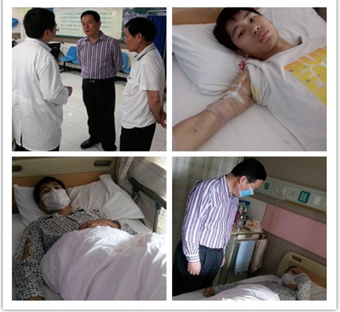 得知徐浩剑同学患病的消息,机电系党总支第一时间发出为徐浩剑同学募捐的倡议,消息发出后,老师、同学、校友和各界爱心人士纷纷伸出援手,爱心涌动,心手相牵。机电系同时通过微信朋友圈、QQ群的大力转发,西湖之声、杭州之声电台和青年时报等各种媒体的宣传报道,以及盖粉之家爱心人士的捐款,大家为徐浩剑同学祈祷健康的同时,慷慨解囊,截止目前已募捐到265577.5元的善款,让人倍感欣慰。5月19日下午,刘志华副院长在机电系蒋晓冬副书记的陪同下,前往浙江省第一医院看望了徐浩剑同学,送去了老师和同学们最真诚的问候和良好的祝愿。