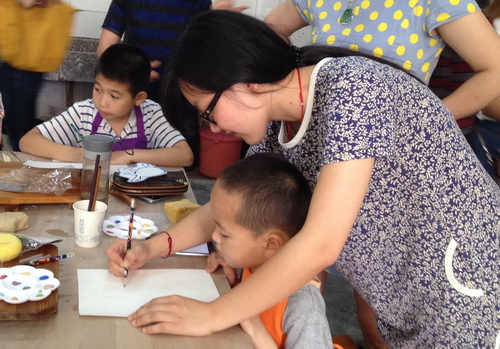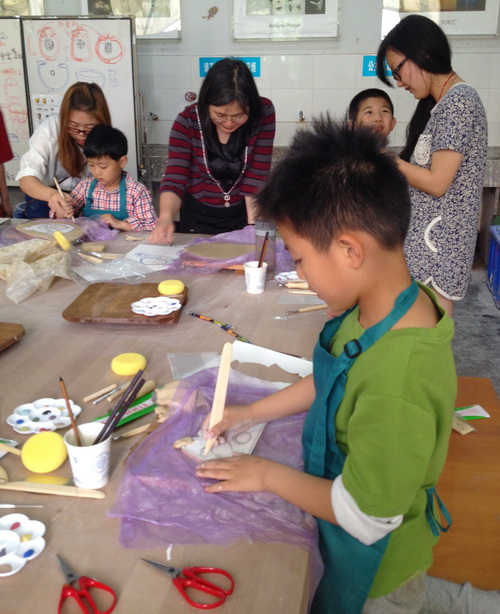 活动原定是一点半开始,但小朋友和家长们都提前到达。活动分为陶泥制作和陶泥彩绘两部分,艺术系余元枫老师给小朋友们做了讲解和示范,让大家自由发挥,做各种各样的花式小碗。40位大小朋友们便在指导下忙活了起来,先和泥、压平、切好、印上图案,再描上色彩,有鱼儿,有蜜蜂,有小熊的,各种五彩缤纷。几个小朋友说,觉得和爸爸妈妈一起做一只小碗很有意思。陶泥彩绘部分更是可以天马行空自由发挥了,有小朋友把树叶印上,有的把小手印印上,一个个独一无二的花瓶就这样完成了。其中,一位艺术系画家爸爸的现场彩绘得到了在场所有家长和小朋友的喜爱和赞赏。