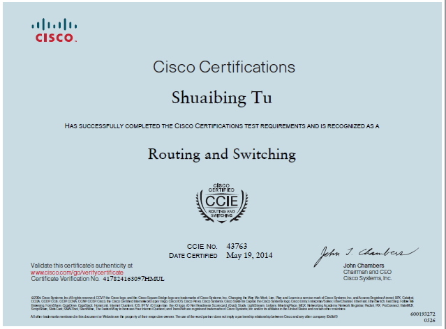 CCIE全称Cisco Certified Internetwork Expert,是美国Cisco公司于1993年开始推出的专家级认证考试。被全球公认为IT业最权威的认证,是全球IT领域中最顶级的认证证书,被誉为IT领域的金牌认证。截止到2014年5月份,全球共有40000多名CCIE,中国大陆共有CCIE约6000人。获得CCIE认证不仅证明技术达到专家水平,得到业界的认可与肯定,更是一种荣誉的象征,是一种自我价值的体现,获得CCIE认证是网络技术人员的梦想。