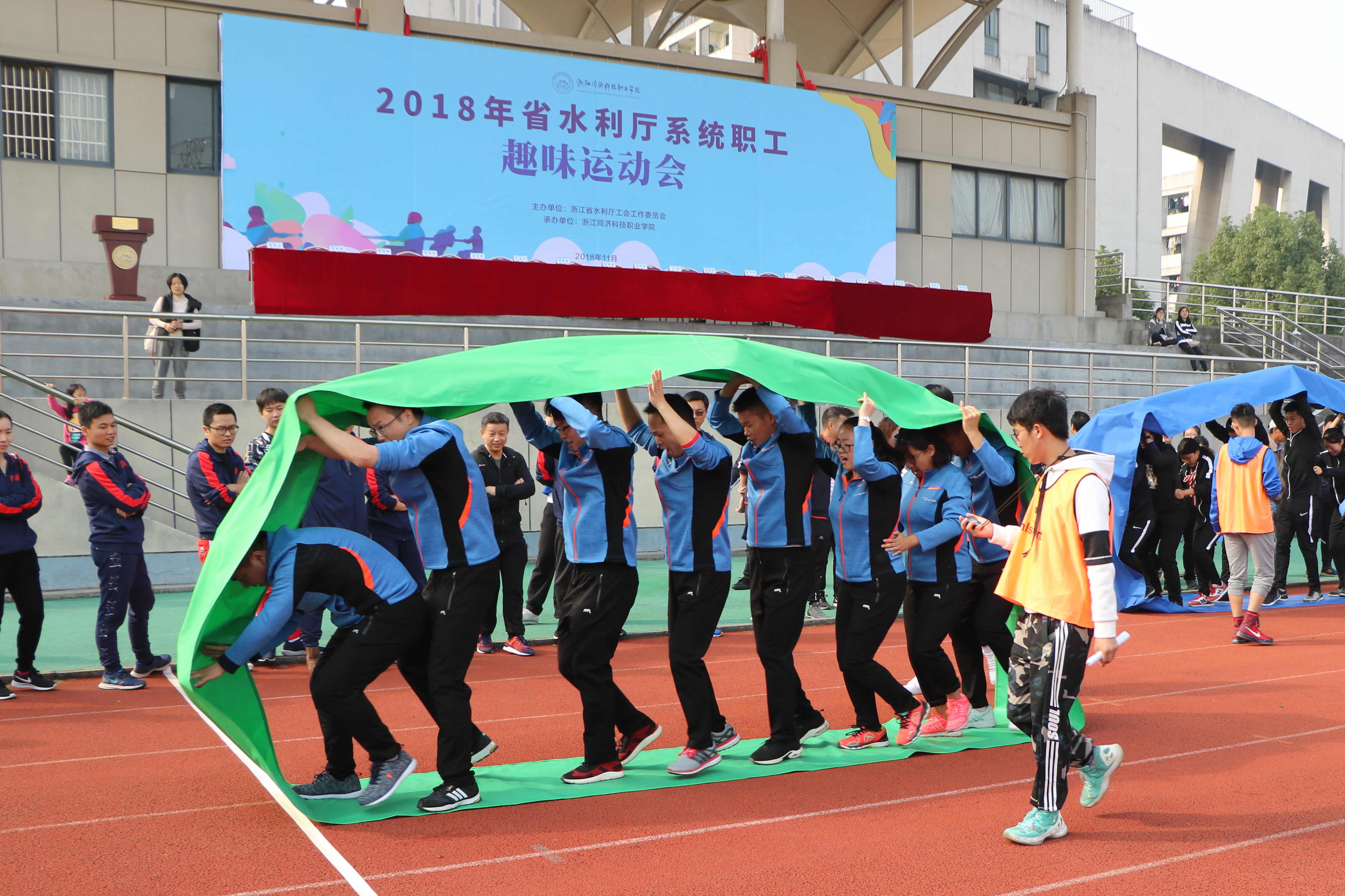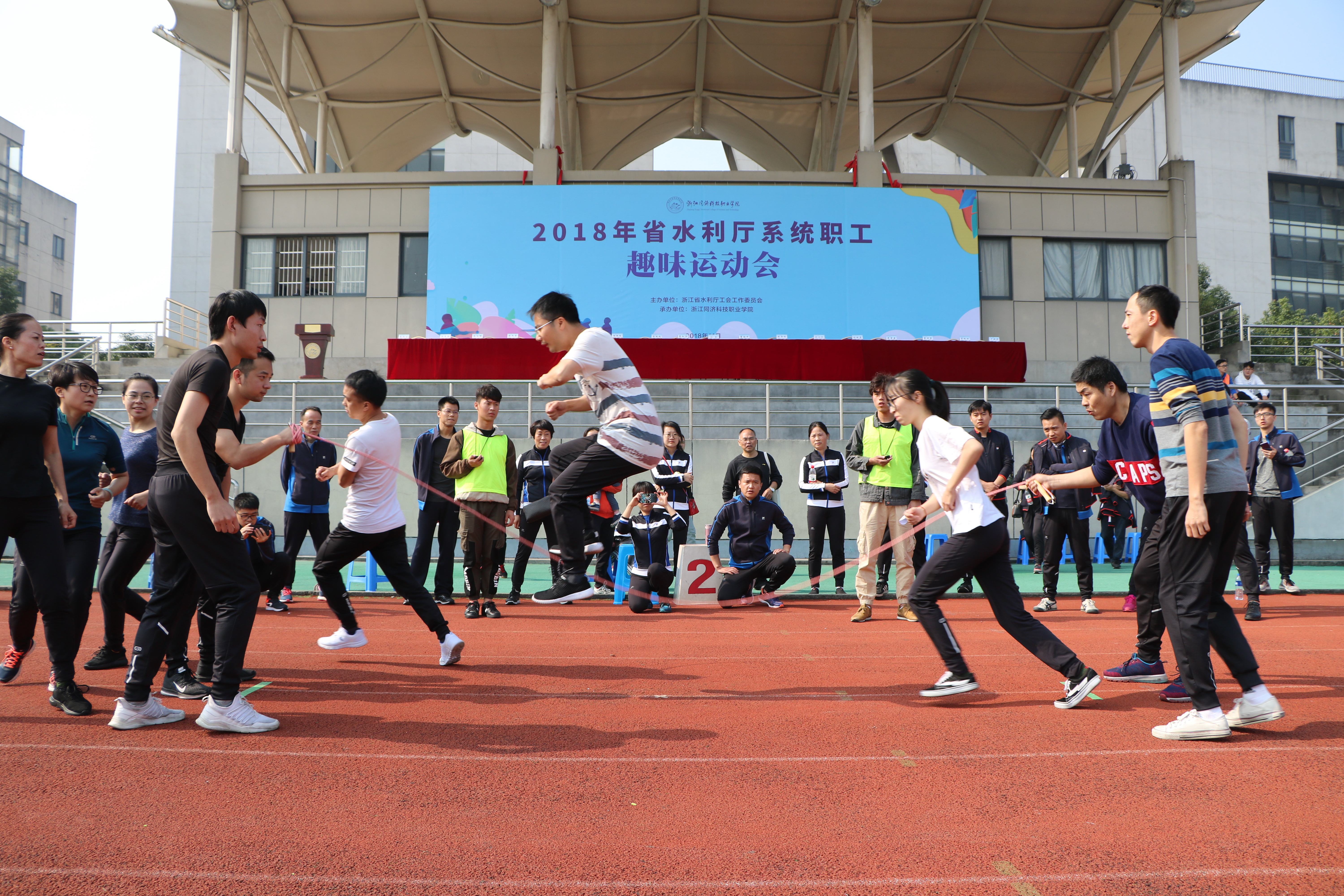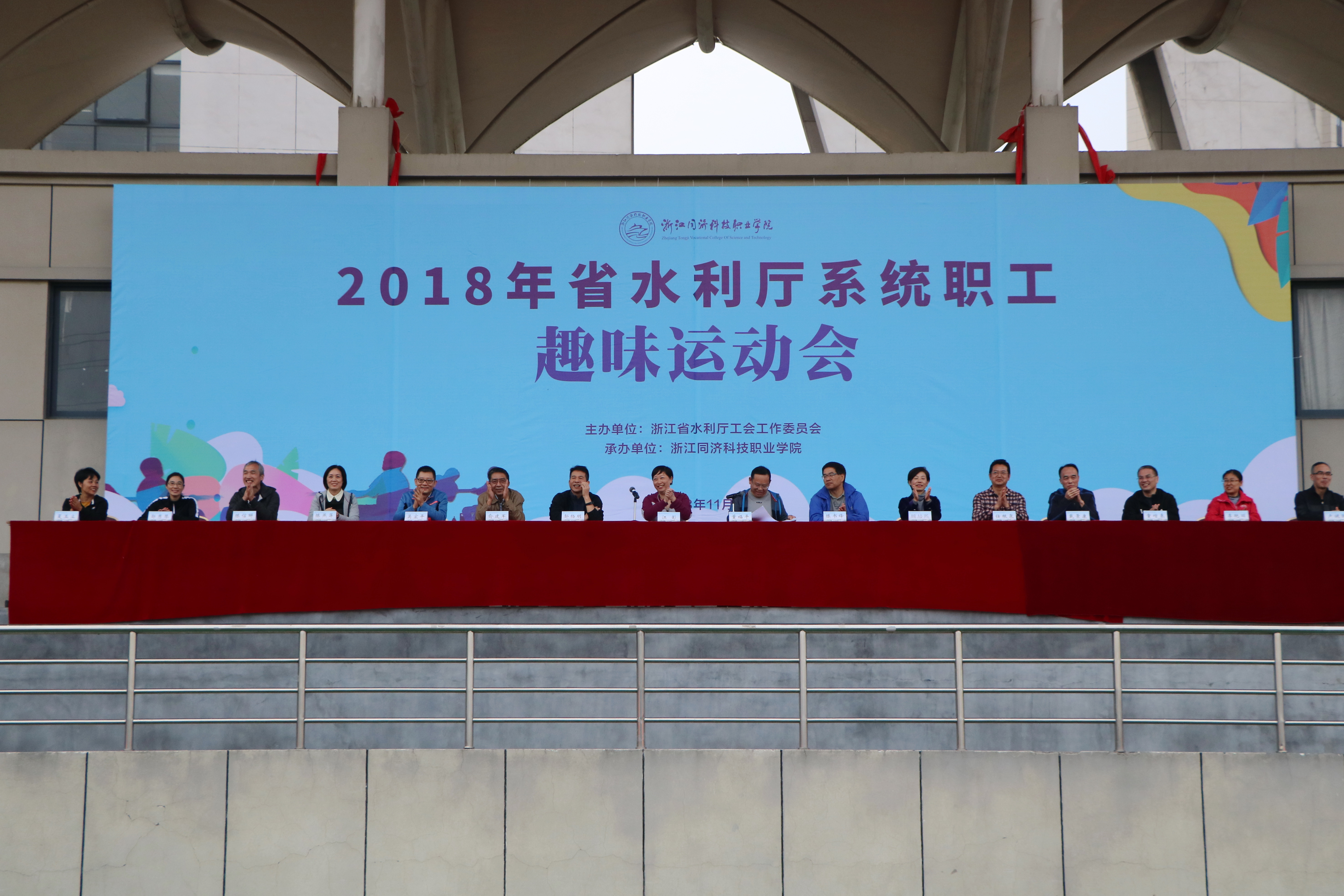11月10日,2018年厅系统职工趣味运动会在我院举行。厅党组成员、副厅长蒋如华,学院党委书记江影、院长梁国钱出席开幕式。蒋如华致开幕词,梁国钱致欢迎词,江影致闭幕词。厅直属机关党委专职副书记、工会主任董福平主持了开幕式和闭幕式。