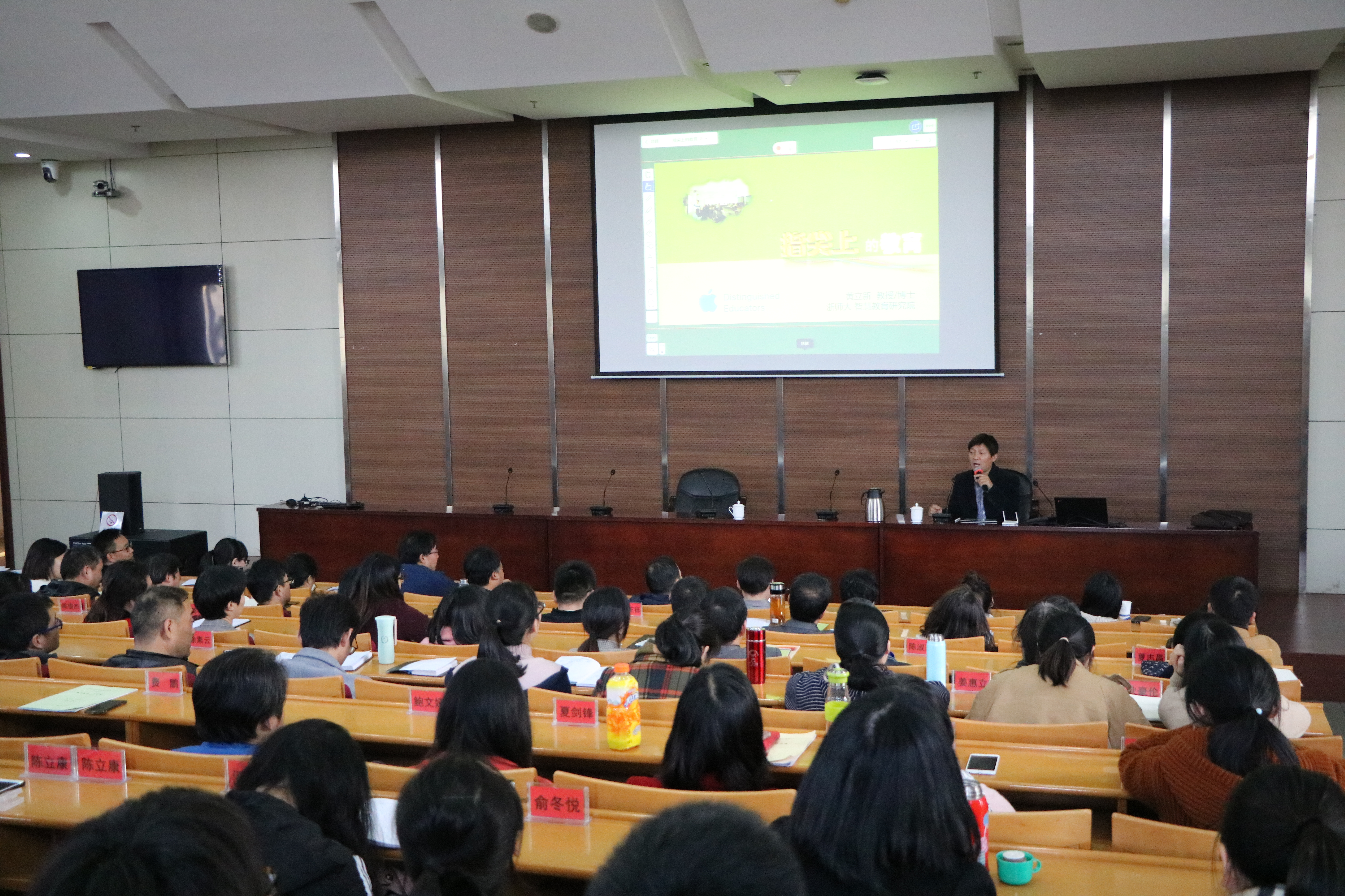 11月28日下午,学院开展集体教研活动,邀请到浙江师范大学智慧教育研究院副院长黄立新教授作题为“指尖上的教育,智慧课堂中的互动教学”的教学信息化能力专题培训。学院院长梁国钱、副校长王建华出席培训会,学院全体专任教师、校内兼课教师、各系负责人、教学秘书及教务处全体人员参加了培训。