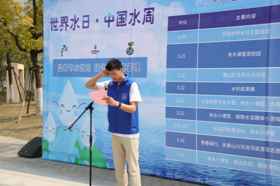 吴宏平副书记讲话。他指出浙江因水而名、因水而生,因水而兴、因水而美。当前省委省政府积极践行新时期治水方针,以治水为突破口加快推进产业转型升级,实施乡村振兴战略,加快建设安全流畅、生态健康、水清景美、人文彰显、管护高效、人水和谐的具有诗画江南韵味的美丽浙江。他强调,学院作为浙江省唯一一所水利类高等职业院校,始终坚定不移地把服务我省水利事业发展纳入到学院办学治学的方方面面,亲水文化和亲水实践已经成为了校园文化的重要组成部分,学院有责任、有义务、有能力把水利政策、水利科普知识和水利发展史向广大群众宣传好,解读好,引导好。他希望广大师生要积极发挥行业专业优势,做节水护水事业的倡导者;积极履行自我主体责任,做节水护水事业的践行者;要积极承担社会公民职责,做节水护水事业的监督者。