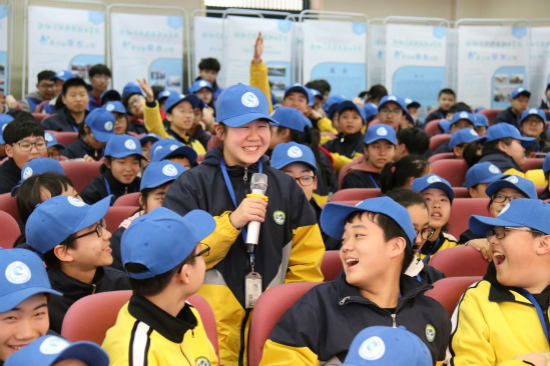 仪式后,学院亲水卫士与200余北干初中的学生开展横幅签名、现场水知识问答,及学院亲水之旅世界水日展览介绍等活动。同学们参与的积极性很高,签名和答题都很踊跃。亲水卫士为他们送上花洒、雨伞、背包、书签等世界水日纪念品,让同学们在娱乐中潜移默化地学到知识。我院首批护水宣讲团讲师张晨辰老师以“节水护水 从我做起”为主题为初二同学作讲座。张老师从浙江水利情况、如何做到节水等多个角度出发,以抛问题送礼物的方式激发学生的积极性,课堂氛围十分热烈。