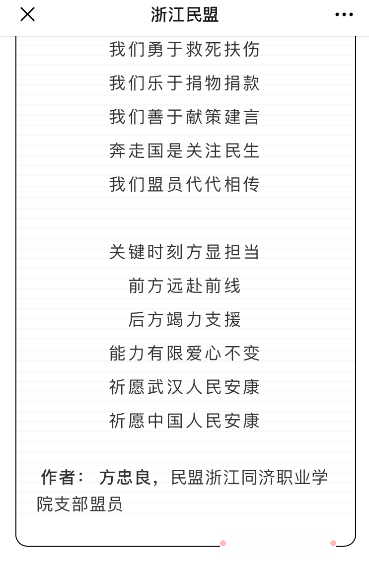 以诗抒情,致敬英雄。盟员方忠良在疫情发生后,全身心投入诗歌创作中,创作了《爱心接力千里支援》《致敬抗疫英雄钟南山》《出征—我是民盟人》3篇诗歌,其中《爱心接力千里支援》在民盟省委会微信公众号上刊登。方忠良作为会计专业部主任,还及时向专业部师生传达抗疫文件精神,按时收集有关疫情资料,积极宣传防控疫情正能量,会计专业学生有多人在所在社区进行防控疫情的志愿者服务。