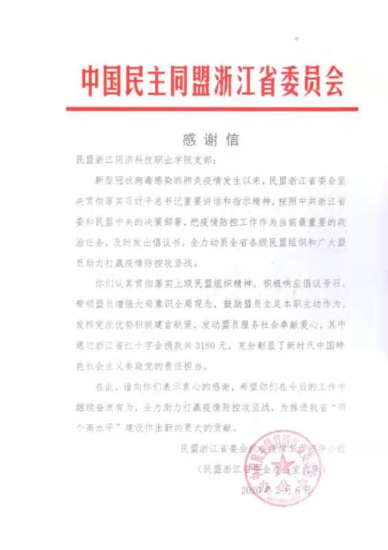 同心同行,爱心捐赠。民盟同济支部在职盟员13人,退休盟员3人。疫情发生后,第一时间发动支部在职人员捐款支援,总计捐款3180元,部分通过浙江省红十字会捐款用以采购一线用的防护服。支部爱心捐款的善举得到了浙江民盟省委会的认可。