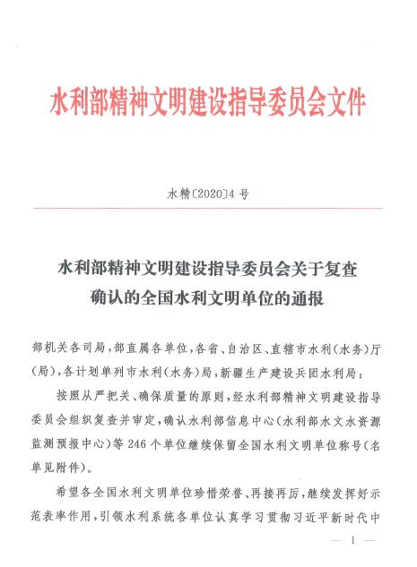 近日,水利部文明委下发《水利部精神文明建设指导委员会关于复查确认的全国水利文明单位的通报》(水精﹝2020﹞4号),我院高质量通过水利部精神文明建设指导委员会复查及审定,继续蝉联“全国水利文明单位”称号。