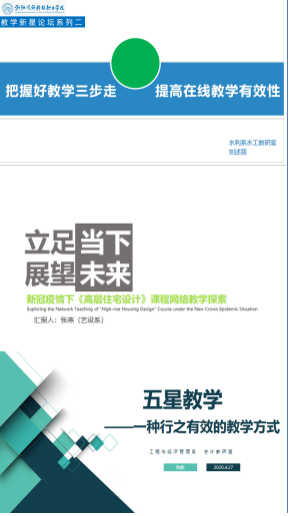 三位嘉宾解锁在线教学技能。水利工程系刘述丽老师分享了《把握好教学三步走,提高在线教学有效性》,从课前设置、课中设计、课后安排三个环节进行教学设计,实现先教后学和先学后教的融合统一;艺术设计系张燕老师以《“立足当下、展望未来”——新冠疫情背景下高层住宅设计课程网络教学探索》为题,提出建构O2O教学组织,运用多种方法,调整课堂节奏、激发课堂教学活力;工程与经济管理系陈影老师聚焦《五星教学——一种行之有效的教学方式》,介绍了五星教学法及教学流程,列举了多个教学案例,并详细介绍了五星教学法在线上教学中的应用。