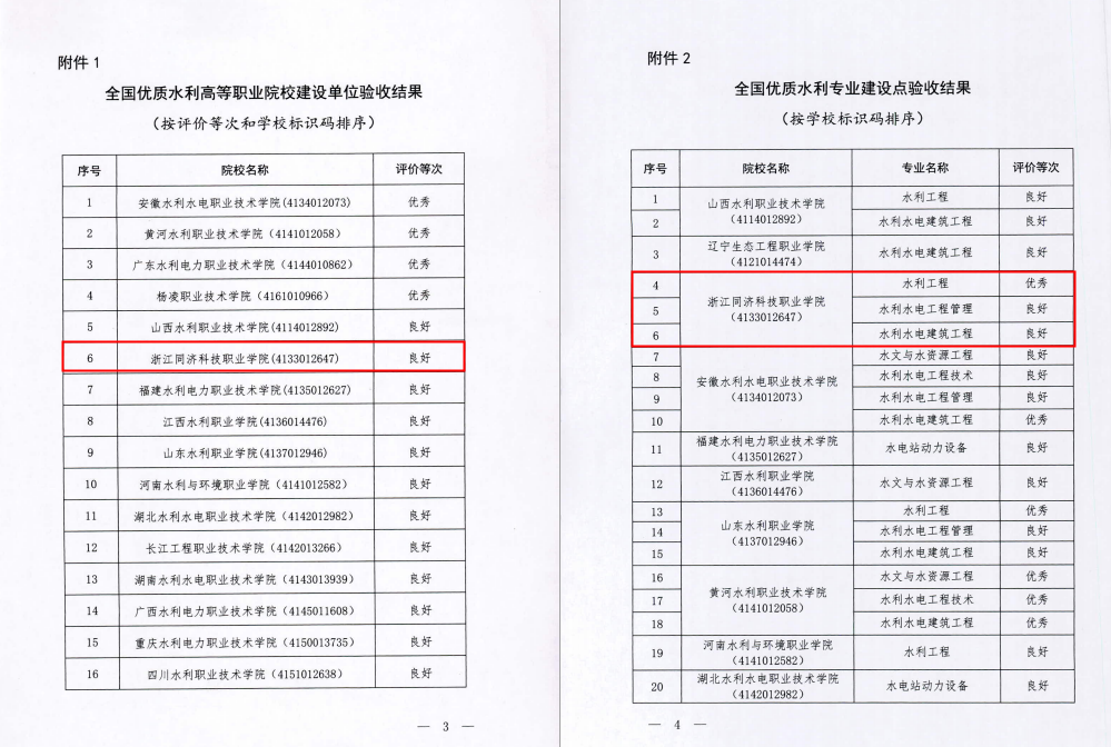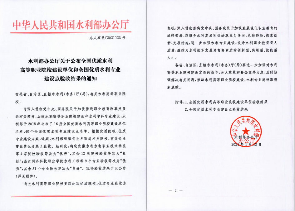 根据水利部办公厅印发《水利部办公厅关于公布全国优质水利高等职业院校建设单位和全国优质水利专业建设点验收结果的通知》(办人事函〔2021〕23号),我校被确定为全国优质水利高等职业院校,水利工程、水利水电建筑工程、水利水电工程管理三个专业被确定为全国优质水利专业,其中水利工程专业评定为优秀,我校成为全国水利“双优”建设验收中获得“优秀”荣誉的6所院校之一。