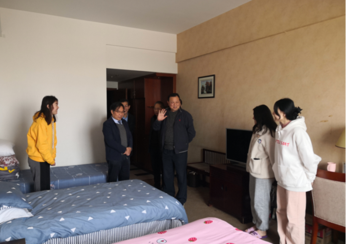 蒋如华一行重点看望因疫情留校学生和学生公寓楼H楼施工工地安全生产情况,详细询问学院对留校学生的管理方案、具体安排,代表水利厅送上诚挚问候和节日祝福。蒋如华与同学亲切交流,了解留校学生的生活、学习情况,希望大家严守校园纪律,配合学院防疫要求,充分利用假期提升自己,合理安排学习和生活。同学们表示,会积极配合学院的疫情防控工作,做好自我防护,积极努力学习,不断进步。