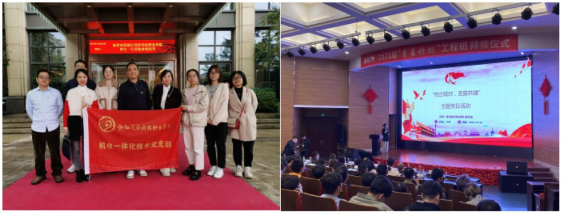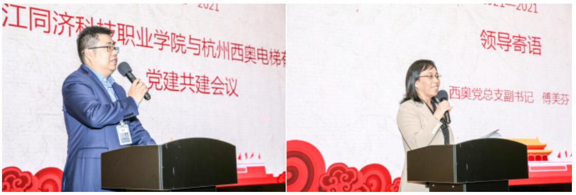 活动期间,双方支部书记分别汇报交流了支部建设情况。俞嘉琛书记从公司概况、超级工厂、产品与服务、人才培养、经典业绩、荣誉与责任六大方面介绍了支部情况,强调了党建工作是作为职工服务、服务基层提供思想上和政治上的保障,同时表达了企业和学校合作进行人才培养是共享发展成果的双赢方案。机电一体化技术党支部书记蒋帆介绍了支部情况,包括支部基本情况、党史学习教育情况、日常党建工作展开情况、取得主要成绩等,表达了支部希望通过校企党建合作,实现党的建设与校企发展建设良性互动,将党史学习教育成果转化为服务企业、服务学生的动力,达到“推动发展、服务师生、凝聚人心、促进和谐”的目标要求。西奥电梯有限公司党总支副书记傅美芬表示对浙江同济科技学院的师生的到来表示热烈欢迎,介绍了当前人才工作政策和制度,表达了对学生充分的肯定并寄予厚望。
