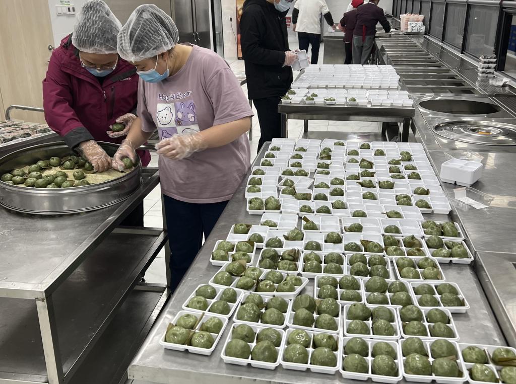 在清明节来临之际,4月2日中午,后勤服务公司组织了“教职工餐厅送青团”主题活动,为每位前来就餐的老师赠送青团一份。为了本次活动的顺利开展,后勤公司餐饮部的员工提前一周精心筹备。为确保新鲜和美味,他们利用工作空余的时间摘青、捻青,全程自学青团的制作方法。经过大家的共同努力,赶在清明假期最后一天的工作日完成制作。碧绿如玉,糯韧绵软的青团新鲜出炉。一笼笼青团摆在案板上,阵阵独有的清香扑面而来,随便捻起一个,入口鲜香,甜而不腻,受到了前来就餐的老师们一致好评。4月5日清明节当天中午,后勤公司还将为学生们准备免费赠送的青团,希望能给留校学子一份家的感觉。