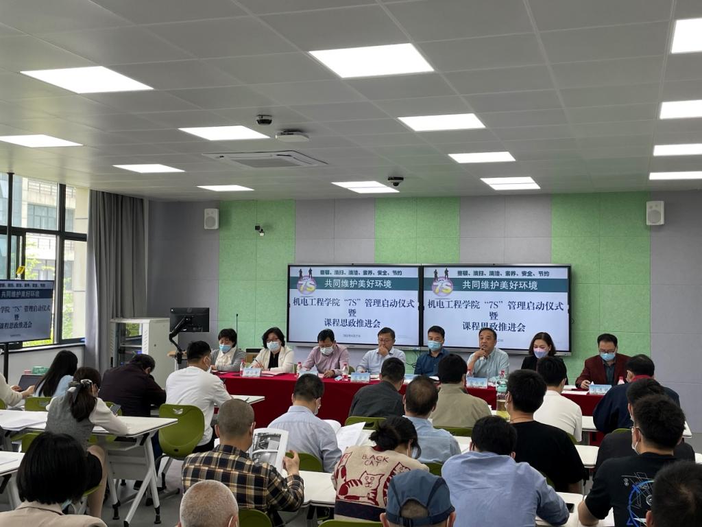 在当前疫情背景下,机电工程学院一手抓抗击疫情,一手抓工作,持续推进各项工作更上一个台阶。在深入开展“三全育人”、课程思政工作基础上,全面开展“7S”管理活动,于2022年4月27日举行了“7S”管理启动仪式暨课程思政推进会。学校副校长沈自力、朱兆平出席会议并讲话,教务处、学工部、后勤基建处负责人、机电学院负责人及全体教职工通过线上线下结合的方式参加了会议。