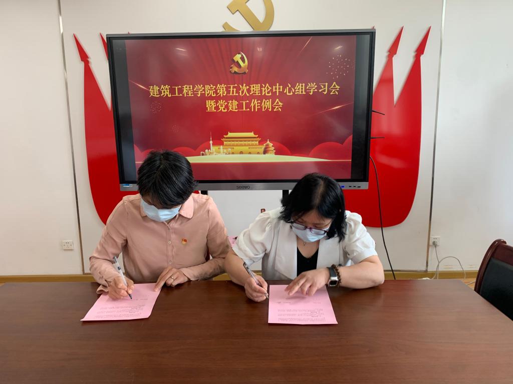 随后,院长杨海平与五位专业部主任签订《2022年党风廉政建设责任书》,党总支书记蒋晓冬和五位支部书记签订《2022年党风廉政建设责任书》。会上,李芬红代表建工支部汇报省级样板支部建设情况,张晔楠代表造价支部汇报校级样板支部建设情况,与会人员对两个支部建设提出了中肯的意见和建议。