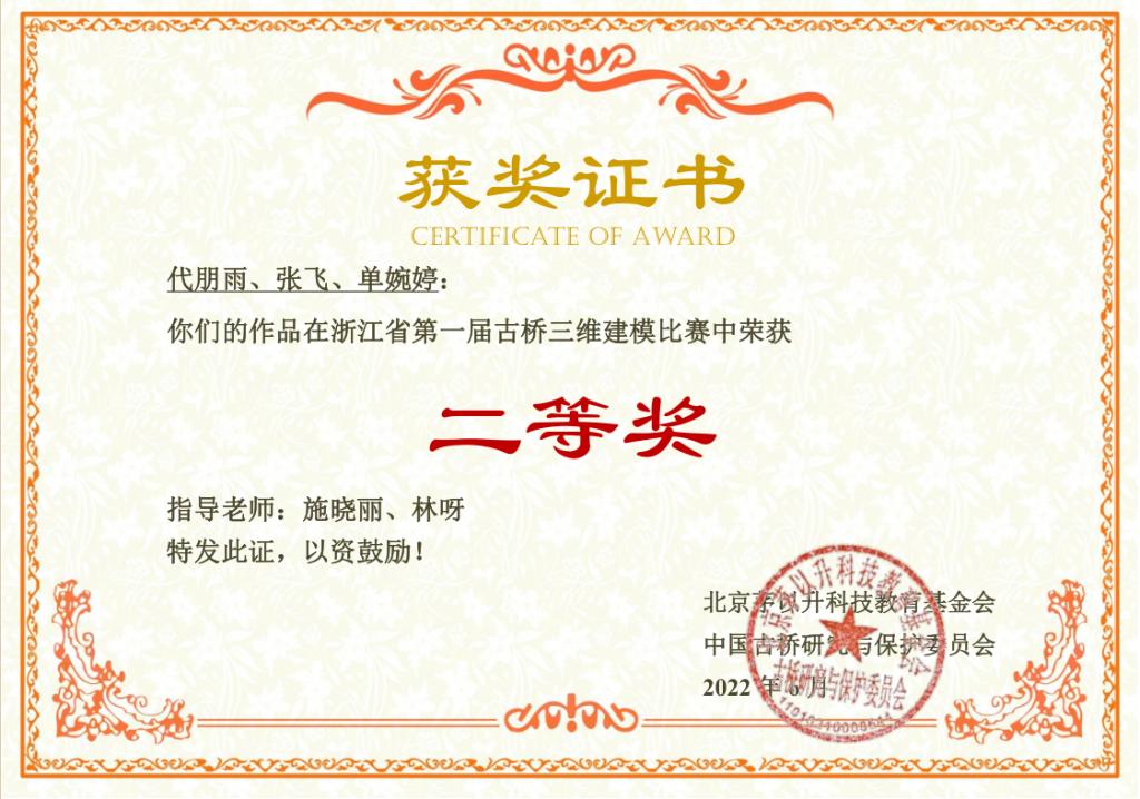 北京茅以升科技教育基金会古桥研究与保护委员会与浙江交通职业技术学院共同举办的浙江省第一届古桥三维建模比赛已于2022年5月30日圆满落幕,经大赛专家委员会评审、组织委员会审定,我校建筑工程学院参赛队伍以优异的表现和优秀的原创作品分别获取浙江省第一届古桥三维建模比赛的二等奖和三等奖。