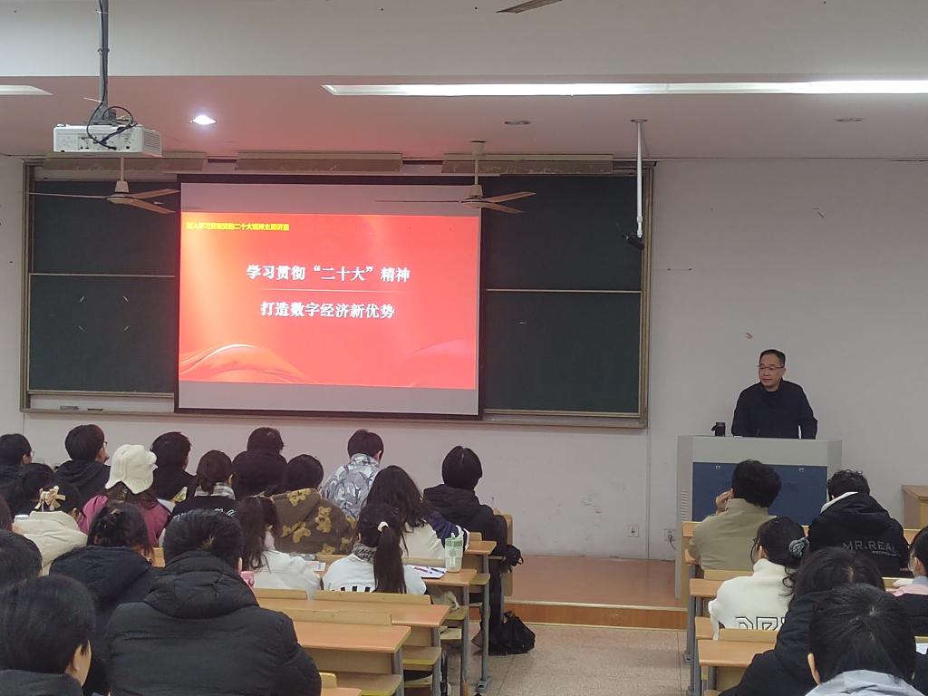为了进一步宣传贯彻党的二十大精神,推动党的二十大精神进校园进课堂,在新征程中展现高校担当,放飞青春梦想,12月8日上午,校党委委员、副校长姜伟同志围绕学习贯彻党的二十精神,以《打造数字经济新优势》为题,为经济与信息学院学生讲授习近平新时代中国特色社会主义思想概论课。