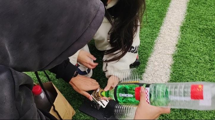 参赛队伍带上自行收集的废弃塑料瓶和组装材料来到A307教室,领取部分必备材料包之后便开始动手设计制作水火箭,小组成员从美观度、发射距离等角度进行优化调整。制作完成后,参赛选手们前往操场进行水火箭试发射,当各小组成果被摆上发射台时,小组成员既兴奋又紧张。随着气压升高,水火箭利用水和空气的质量之比,压缩空气把水从火箭尾部的喷嘴向下高速喷出,在反作用下,水火箭快速上升,加速度、惯性滑翔在空中飞行,出现一道道完美的飞行轨迹,最远的小组发射距离达到70米,在场的同学们都不禁发出惊呼,惊叹于科技与智慧的力量.