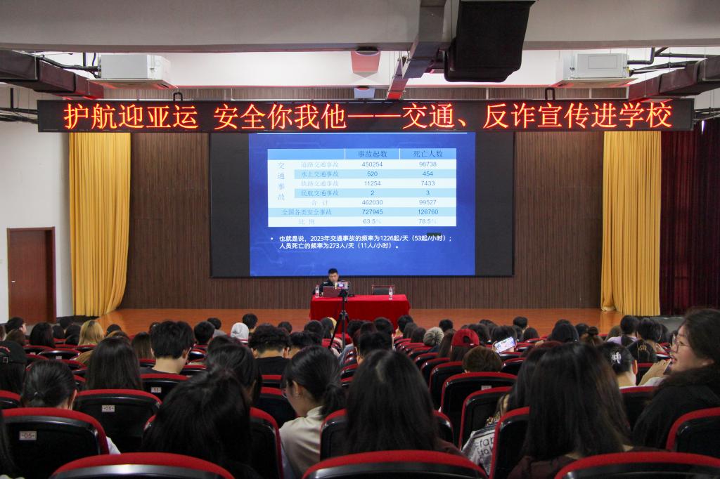 为进一步增强同学们道路交通安全及防范电信网络诈骗意识,2023年4月19日下午,艺术设计学院联合钱江社区邀请宁围街道交警中队交警、派出所民警在瓯江楼三楼报告厅举办“护航迎亚运 安全你我他——交通、反诈宣传进学校”专题讲座。学院大一同学到场聆听,大二、大三同学通过观看线上直播参与讲座。