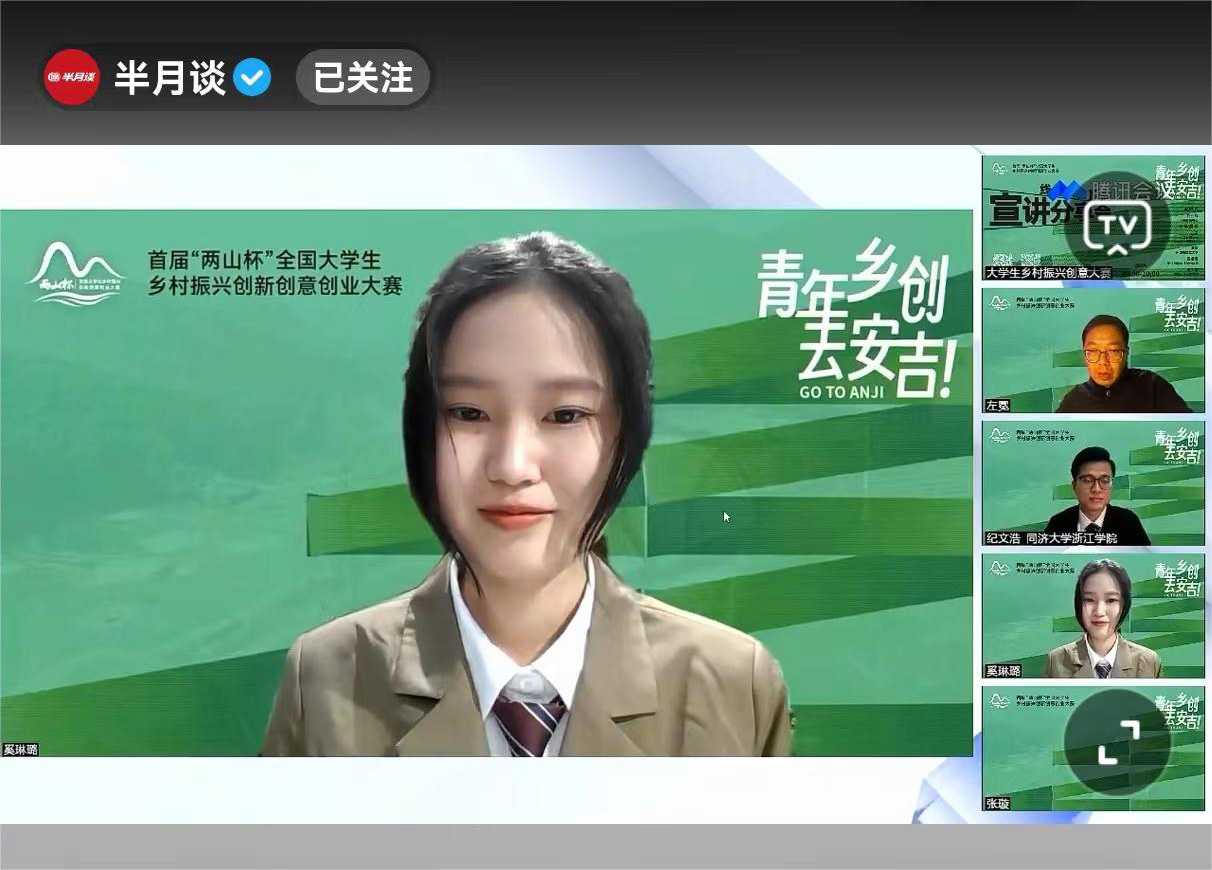 4月22日,首届“两山杯”全国大学生乡村振兴创新创意创业大赛启动仪式在新华社《半月谈》抖音平台直播,艺术设计学院2022届毕业生奚琳璐受邀在直播上作个人成长经历分享。大赛由新华通讯社主办,新华社浙江分社和湖州市安吉县等联合承办,面向全国大学生,清华大学、浙江大学、南开大学、上海交通大学、中山大学等20所知名高校的学生代表参加了启动仪式。