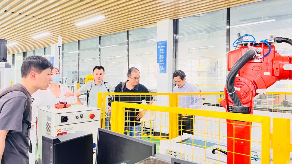 会上,金永琪院长和葛鲁波院长相互介绍了双方学院的发展历史、专业设置和专业群建设经验。金永琪院长分享了机电学院“产教融合、协同育人、校企共同体”的合作经验,介绍了学院开展的教育部中德先进职业教育合作项目(SGAVE)、双元制试点项目和精雕合作项目等项目建设情况。另外金院长向来访教师介绍了机器人实训室建设经验。葛鲁波院长分享了其学院“总部—基地”、“县校合作”模式和校企合作共建教学工厂经验。随后蒋帆主任带领葛鲁波院长一行前往工业机器人实训室和智能机器人创客空间进行参观,徐跃增教授陪同参观,介绍了机电一体化技术专业开展学生竞赛情况。
