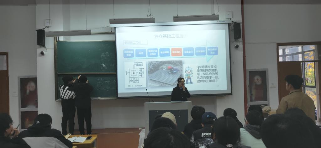 庞崇安将理论知识与实际工程案例紧密结合,通过丰富的图片、视频和模型展示,生动讲解了独立基础施工的关键要点。授课中,还特别安排了学生参与环节,邀请学生亲身体验独立基础的钢筋布置过程。
