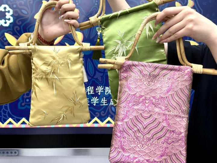 宋锦起源于宋代,最初专为宫廷织造,凭借其精湛的技艺、典雅的色彩和细腻的质地,迅速成为中国传统丝织品中的佼佼者。它不仅是实用的织物,更被赋予了丰富的文化象征意义,常作为珍贵礼品用于外交、祭祀等重要场合,见证了无数历史时刻。活动中,王老师引导民族学生学习宋锦织造技艺的基础知识,包括宋锦的独特组织结构、色彩搭配原理、织造工具使用方法等。理论学习结束后,便是充满创意与乐趣的实践环节。每位同学都根据自己的喜好,精心选取了面料和竹编材料,开始创作。剪裁、缝纫,看似简单的动作,在同学们手中却充满挑战。大家相互交流、相互帮助,遇到问题时,志愿者们及时上前指导。经过一番努力,一件件作品逐渐成形。活动的尾声,同学们拿着精心制作的宋锦手提包合影留念。