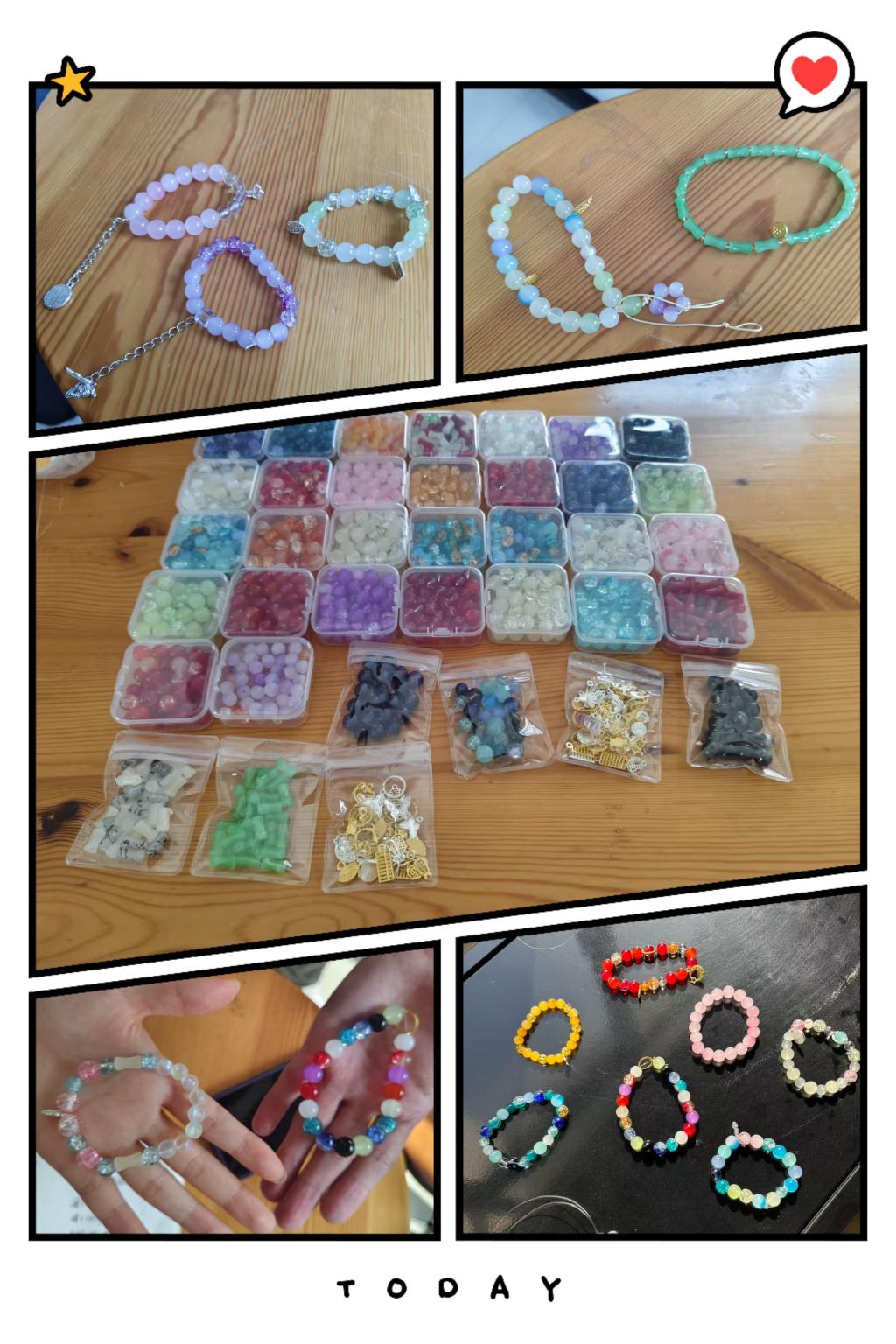 活动现场,五颜六色的珠子、丝线、配饰等工具整齐陈列,同学们一进门便被吸引围到桌前。挑选珠子时,大家化身“色彩搭配师”,有同学为搭配出渐变效果,反复比对十几种颜色;串制过程中,又瞬间变成 “手工匠人”,屏息凝神,专注地将珠子一颗颗穿过丝线,时不时用手指调整珠子间距。“你看我这个配色好看吗?”“这个小配件是不是很合适?” 欢笑声与讨论声交织,紧张与焦虑在欢声笑语中渐渐消散。