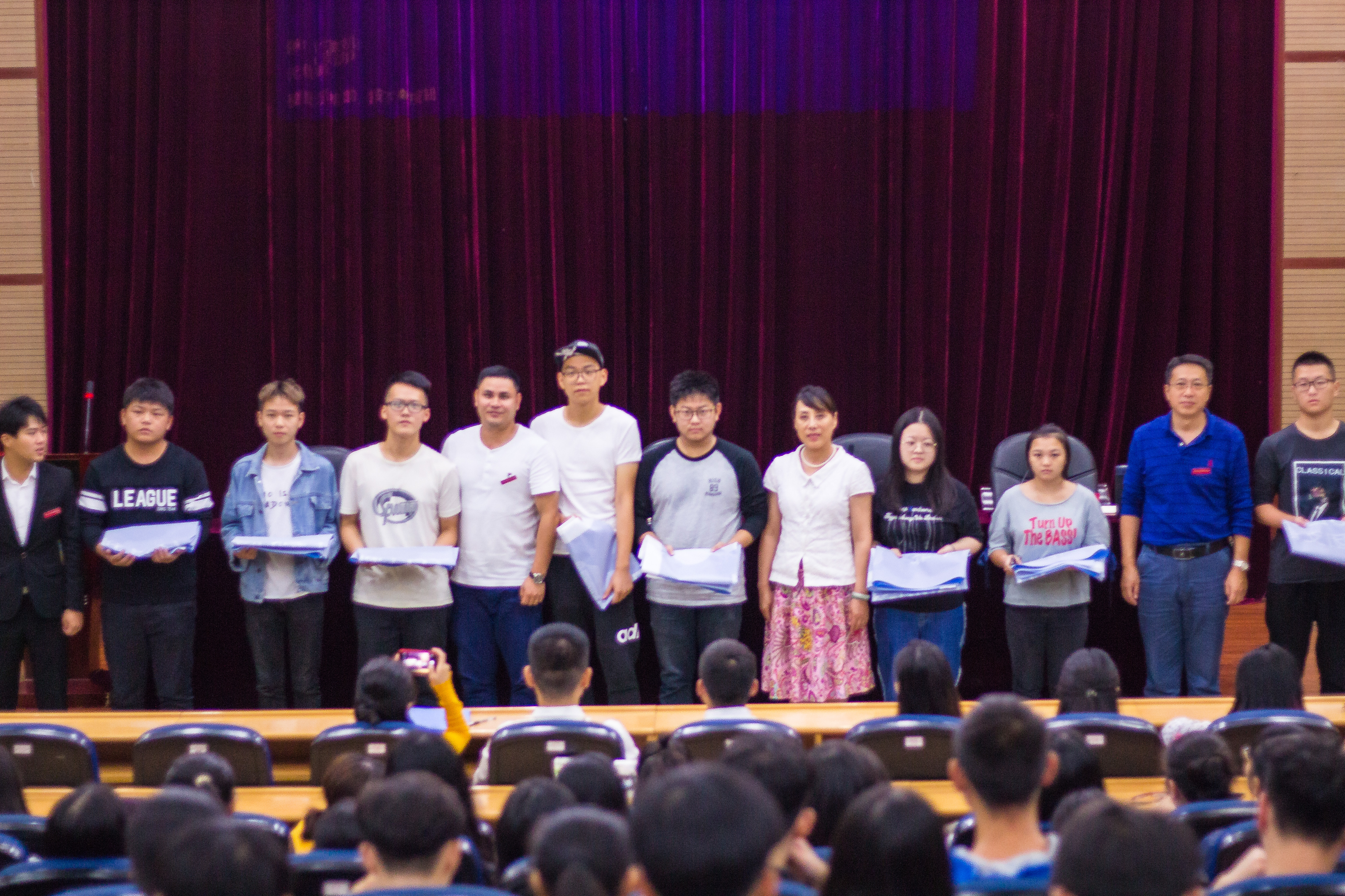 肖斌老师代表全系教师对新生的到来表示热烈的欢迎,并提出了在校期间学习和生活的四点建议。新生代表曹钱烽上台发言,决心不负家长、老师和社会的期望,在今后的学习和生活中铭记校训、严格规范自身、勇敢开拓进取。开学典礼最后,9个新生班接受了象征着团结、友爱、求知、进取的班旗。