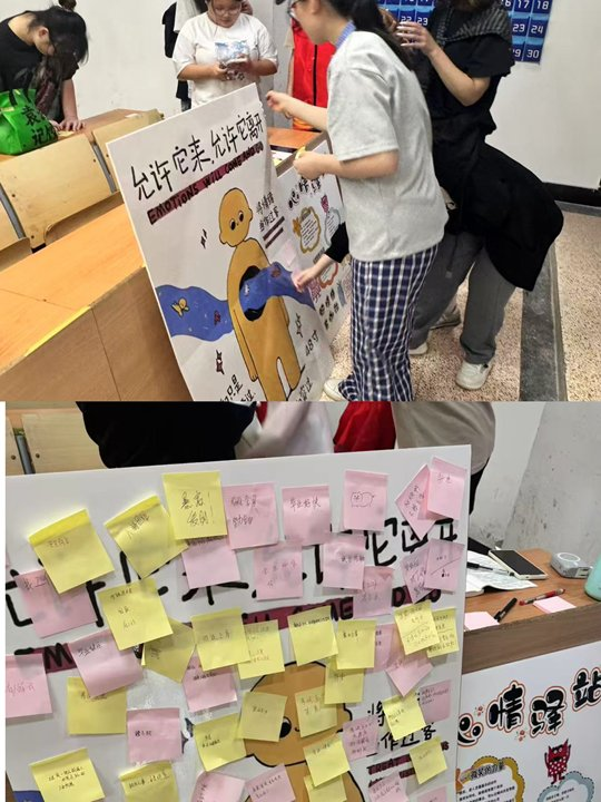 现场还准备了便签与展板,为同学们搭建起心灵交流的互动平台。同学们可将自己遇到的心理问题、困惑或是内心想法写在便签上,贴在展板特定区域;也可以选择回答其他人贴在展板上的便签问题,以匿名方式为他人提供建议、分享经验。这一“书写—回应”的互动模式,让参与者在表达与倾听中提升了共情能力,许多同学表示,看到他人的回复与鼓励,感受到温暖与支持,意识到自己并不孤单。