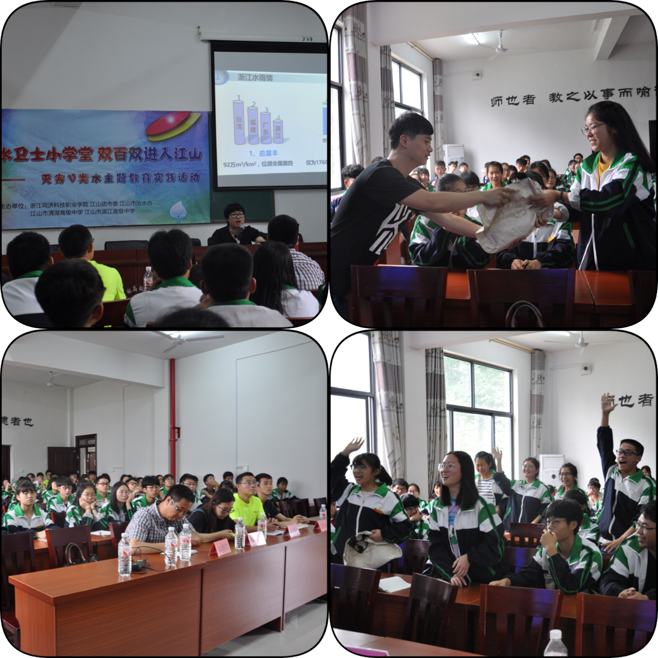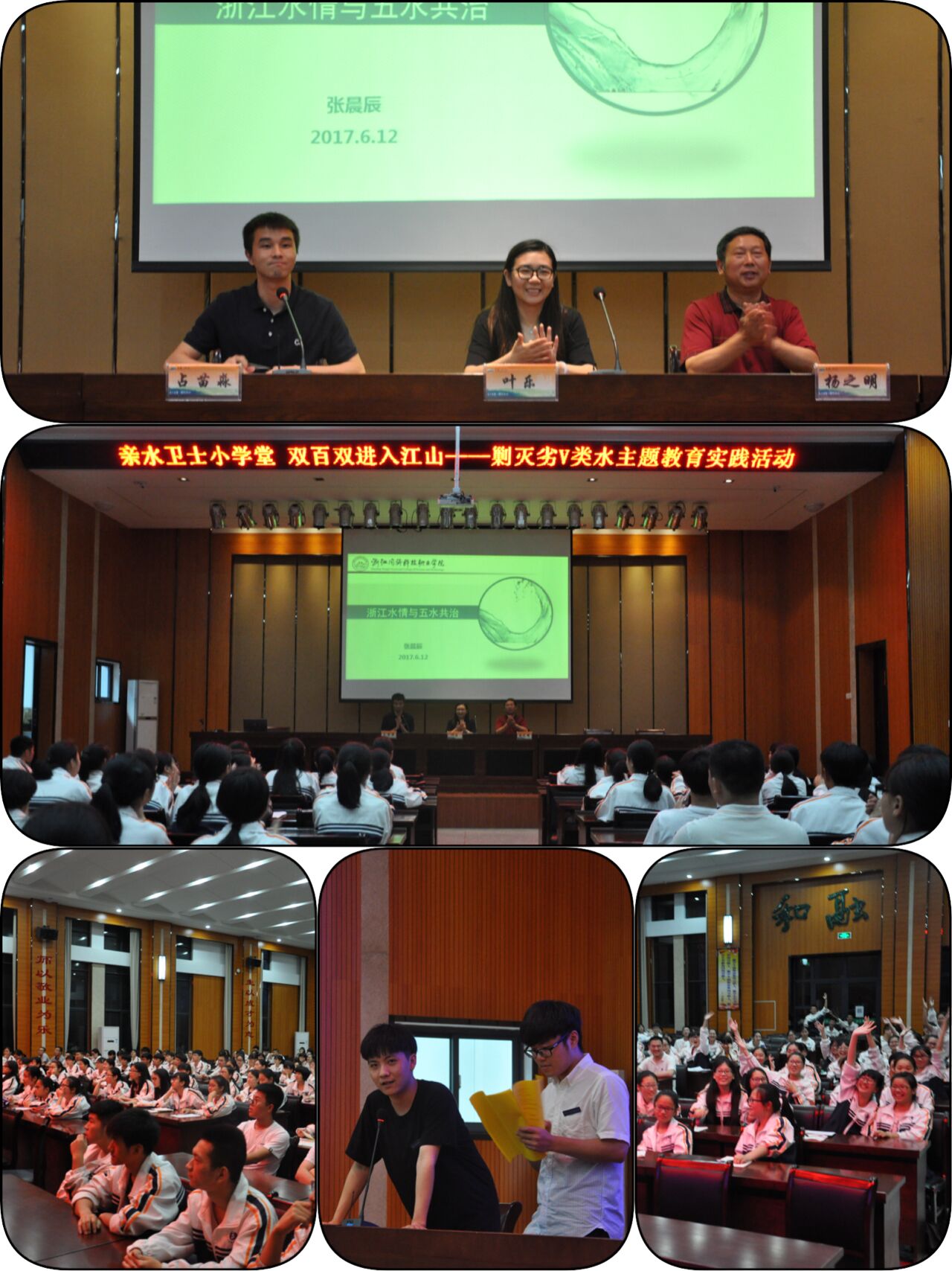 6月13日,瓢泼大雨挡不住学院亲水卫士们助力剿劣的决心,他们与水利系专任教师一起,赶赴江山市清湖高级中学、滨江高级中学举办两场剿灭劣V类水主题讲座。本次活动由学院联合江山团市委共同举办,学院学工部副部长团委副书记叶乐、水利系副主任刘进宝、江山市团委副书记占苗淼、清湖高级中学副校长周伯才、滨江高级中学校长杨之明等领导出席本次活动,学院团委老师汪骅、水利系老师张晨辰、学院亲水卫士志愿者、清湖高中和滨江高中300名同学参加活动。